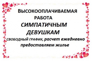 Высокооплачиваемая работа симпатичным девушкам. Расчет ежедневно,охрана,график свободный. Реально много заказов. От Вас только желание заработать.