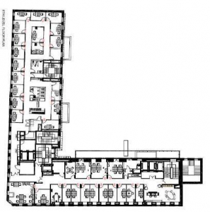 Инфраструктура на этаже; отдельные кабинеты, зона ресепшен, две кухни, туалет, переговорная комната, сервисная зона.