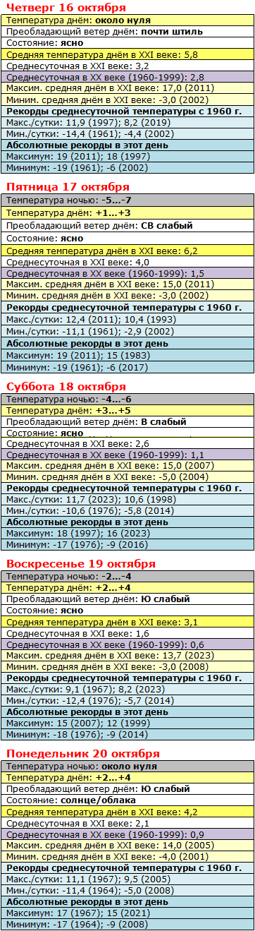 Температура что в первой, что во второй декаде стабильно держится примерно на 4-5 градусов ниже климатической нормы – но в ближайший уикэнд по крайней мере днём ожидаются плюсы, а в воскресенье с понедельником, возможно, даже суточная температура возвысится над нулём. Переломный момент, однако! Ежели верить дальним прогнозам на следующую неделю, то грядёт лёгкое потепление вплоть до плюсовой температуры даже ночью – и скорее всего без осадков...