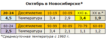 Октябрь XXI века повысил градус октября второй половины прошлого века на 1,5 градуса, передвинув теоретический старт зимнего сезона с 24 числа аж на 2 ноября. В раскладе по десятилетиям сей процесс выглядит следующим образом: