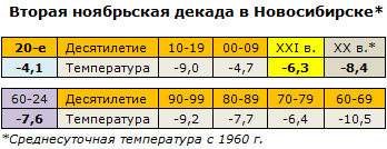 Середина ноября хоть и стала значительно теплее в Новосибирске в двухтысячных годах, но обратите внимание, как сильно отличалась погода в это время в первом десятилетии XXI века от второго!