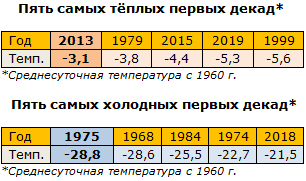 Любопытно, что в последние десять лет средняя температура всех трёх декабрьских декад держится в пределах между 12 и 13 градусами ниже нуля. Такой вот новый тренд...