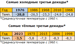 В последнее время, как видите, концовка декабря стала ощутимо теплее, так что не исключено, что вторая половина третьего десятилетия нового века начнёт «подгонять» свой средний градус к общему знаменателю. Будем надеяться, что сей процесс начнётся не в этом году. Напомню и две самые «отвязные» пятёрки, случившиеся за последние 65 лет: