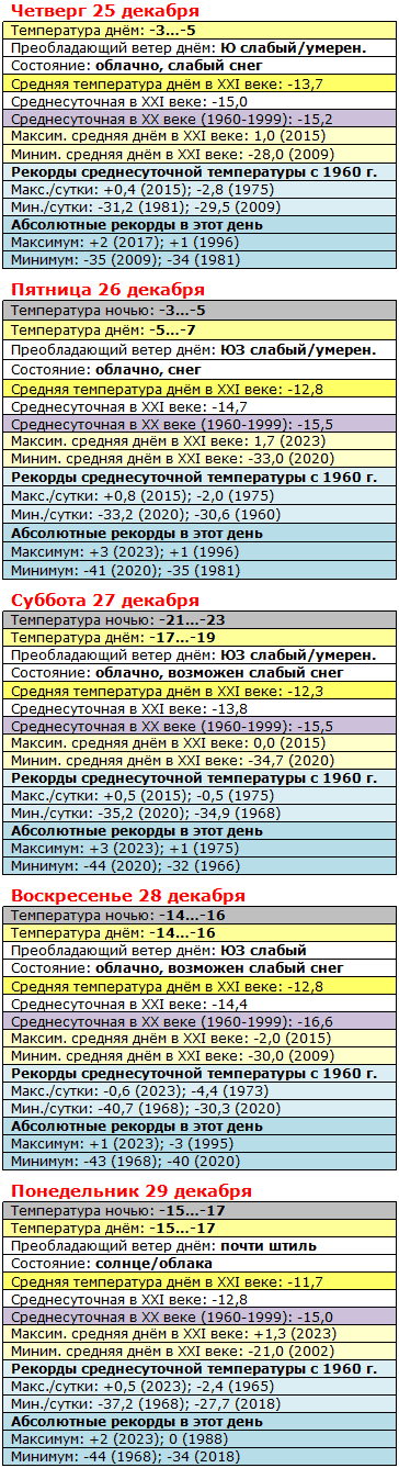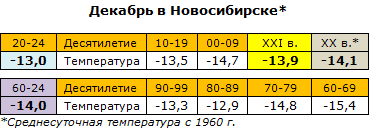 Вернёмся к нашим баранам. Предварительные итоги декабря уже, пожалуй, можно прикинуть. Суточная температура ожидается где-то градуса на два выше климатической нормы, сложившейся в XXI веке. Впрочем, во второй половине прошлого века погода не шибко отличалась от нынешней, можете в этом убедиться.