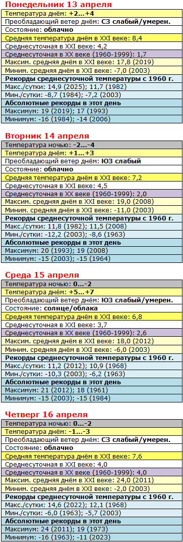 Вероятный снег в прогнозах вновь присутствует, но, опять же, еле заметный – вроде того, что кружил в минувшую субботу, когда в измерительных тазиках метеорологов не набралось влаги даже на десятую долю миллиметра, да и тротуары толком не увлажнились. Тем не менее, давайте смиримся: середина апреля в этом году выдалась провальная и перечёркивает напрочь все весенние завоевания начала месяца. Если первая декада принесла 3,5 градуса над климатической нормой, то вторая опустит планку на ту же величину под свою норму, сложившуюся в двухтысячных годах на текущем календарном отрезке...