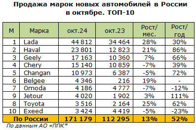 В десятке лидеров продаж впервые с февраля нынешнего года появилась любимая многими нашими автолюбителями Toyota. Geely за счёт удачных продаж в октябре обошёл в рейтинге Chery, которая, напротив, слегка сбавила обороты.