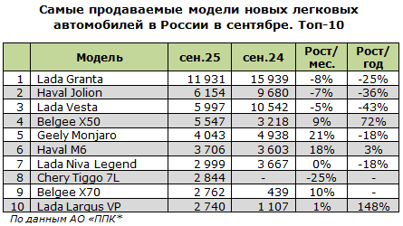 В ТОП-10 модельного рейтинга впервые попал кроссовер Belgee X70 за 2,3 млн рублей в базовой комплектации, а также Lada Largus VP – редкий гость в десятке лидеров продаж. «Ларгус», похоже охотно брали в сентябре после акции невиданной щедрости производителя, уронившего базовую цену на эту модель аж на 250 тысяч рублей.