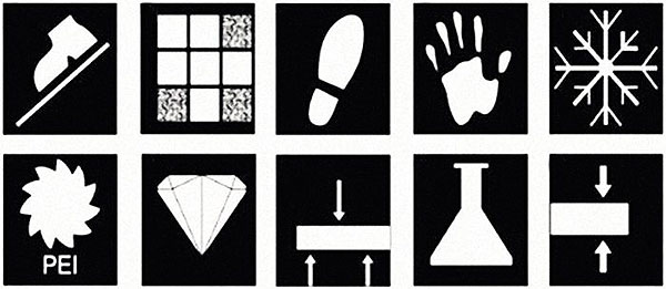 Плитка, предназначенная для укладки на пол, на этикетке имеет значок в виде ступни на чёрном фоне. Если фон картинки светлый или заштрихованный, а ступня, наоборот, чёрная, то это означает, что плитка отличается повышенной износостойкостью.
