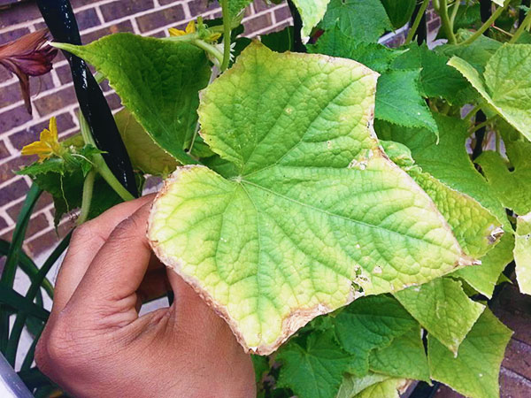 Слишком часто поливать огурцы также не требуется, иначе у растений просто загниют корни. Оптимальный полив огурцов – два-три раза в неделю. Нужно стараться, чтобы капельки воды не попадали на листья - они могут вызвать ожог, «работая» как призмы. Солнечные ожоги могут стать ещё одной причиной пожелтения огурцов.