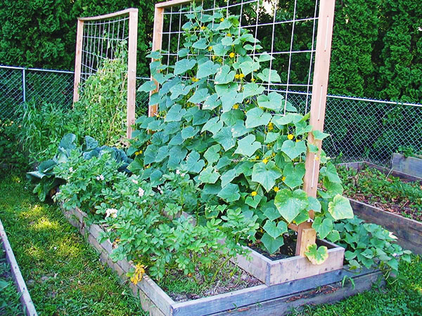 6. Хороший урожай огурцов можно получить, если выращивать их в банках. Для этого у 5-литровых пластиковых бутылей из-под воды или подсолнечного масла надо срезать дно и верхний конус, прикопать на 5 см в землю, заполнить смесью: 1/3 торфа, 1/2 огородной земли, 1/6 золы. В каждую банку высаживать по 2-3 пророщенных семечка. Вдоль ряда надо установить каркас из арматуры и натянуть пластиковую сетку 10х10см.