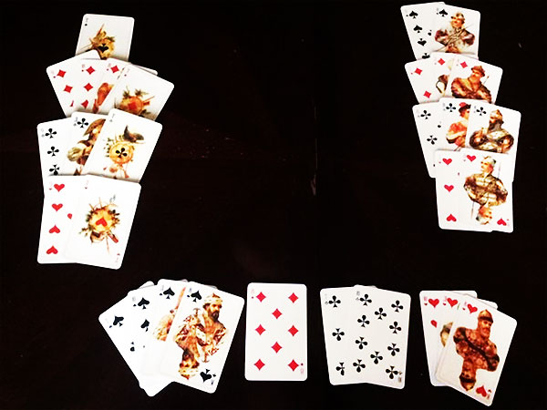 Этюд № 2-5. Расклад следующий: две пики, одна трефа, шесть бубён и козырный туз на второй руке, остальные карты, естественно, на третьей. Играющий, ориентируясь на карту второй руки, выбивает у него трефу с бубной и делает ещё два хода в пику...