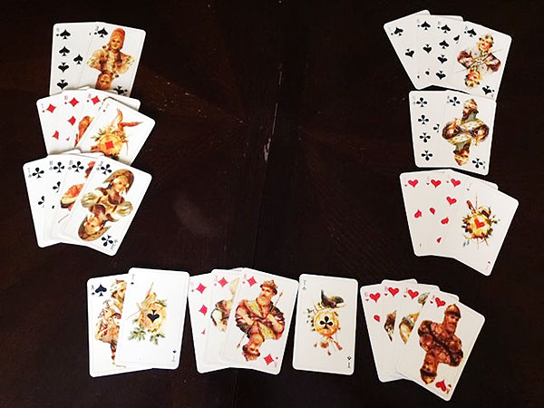 Пика - В, Д, К, Т; трефа - Д, К, Т; бубна - Т; черва - В, К.
