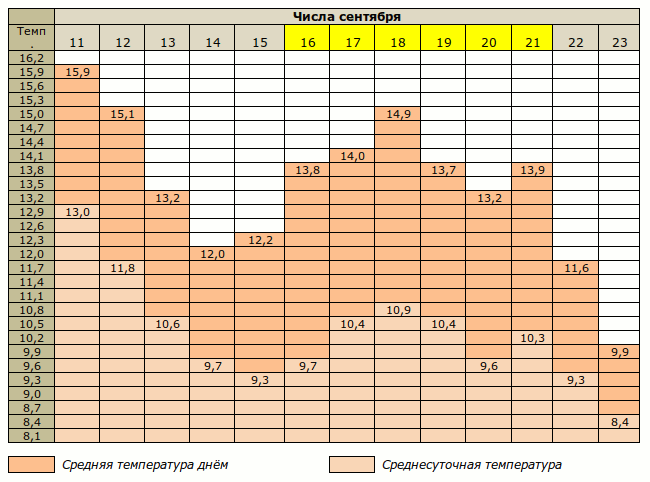Если глянуть на погодный график сентября в XXI веке, то на нём отчётливо просматриваются средние сроки бабьего лета. Начинается оно с резкого подъёма температуры 16 сентября после двухнедельного стабильного падения и заканчивается через неделю 22 сентября, когда температура днём вновь резко падает. Кстати, 22 или 23 сентября (в этом году - 23 сентября) наступает день осеннего равноденствия, когда долгота дня и ночи примерно равны…