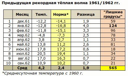 Как видите, в нижней таблице всё гораздо скромнее, абсолютных рекордов вообще нет, а наибольшее количество "лишних" градусов в январе 1962-го оказалось даже ниже среднего значения в месяц нынешней тёплой волны.