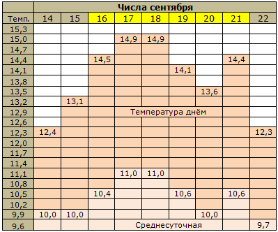 Конечно, это лишь средние цифры, а сам процесс имеет очень много вариаций. Начну с того, что у классического бабьего лета в наших краях есть две волны – сентябрьская и октябрьская. Октябрьскую, кстати, на погодном графике выделить трудно. Можно обратить внимание на определённое замедление падения температуры и некоторую её стабилизацию в период с 9 по 14 октября и очень резкое снижение 18 октября.