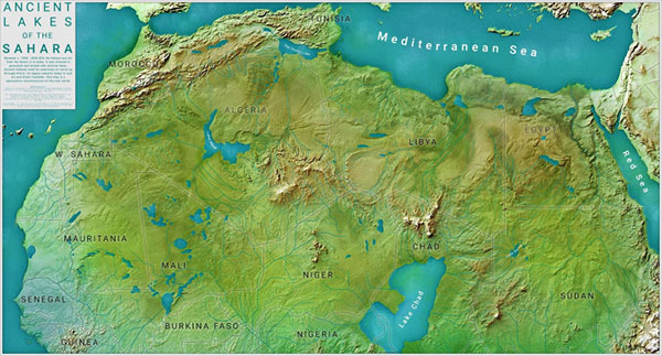 Спутниковые снимки и геологические исследования показывают, что в те времена Сахара была покрыта саваннами и лесами. На территории современной пустыни существовала развитая речная система с множеством озёр. Самое крупное из них, озеро Мега-Чад, занимало площадь около 400 000 квадратных километров - больше, чем современное Каспийское море.