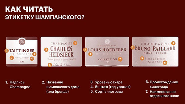 Часто этикетка характеризует состав кюве по сортам винограда, из которого изготовлено Шампанское.