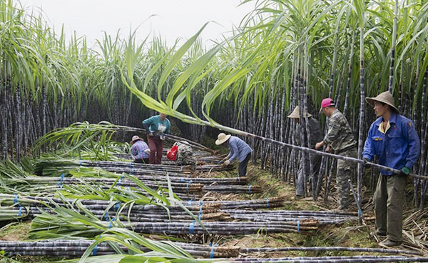 Урожай сахарного тростника собирают несколько раз в год в течение шести лет, затем плантацию высаживают заново. Собирают тростник вручную, срезая стебли ножами-мачете. После этого стебли очищают, а сердцевину отвозят на сахарную мельницу, где её сначала измельчают, а затем протирают в барабанах для извлечения сладкого сиропа. С первого раза практически невозможно извлечь весь сок, поэтому тростник пропускают через барабаны несколько раз, добавляя при этом кипящую воду. Полученный сок заливают в баки, где в процессе кипения в вакууме из него извлекают сахар: вода испаряется, а сахар кристаллизуется.