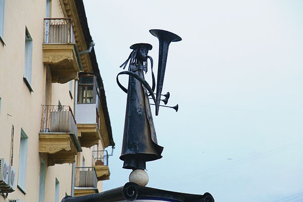 Железный человечек в пальто и шляпе, играющий на трубе — одна из десяти скульптур, которые установлены на афишных столбах исторического квартала «Красная горка».