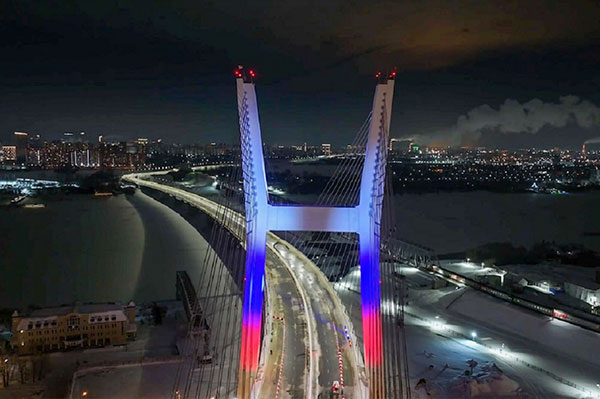 114-метровый пилон в виде буквы «Н» окрасили в цвета триколора в связи с открытием движения. Самые активные горожане выстроились в колонны, чтобы одними из первых проехать по мосту. Как сообщили перед началом движения строители, расчётная скорость движения по мосту – 110 км/ч. Но пока объект не сдадут в полном объёме, скорость будет ограничена.