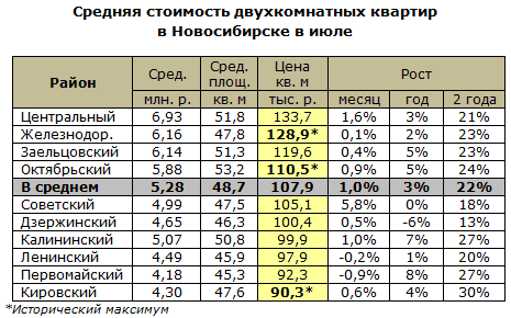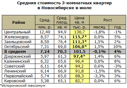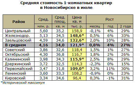 Четвёртый месяц подряд обновляется исторический максимум в Железнодорожном и Первомайском районах, третий месяц подряд – в Калининском. В июле к ним присоединились ещё и продавцы Заельцовского района. Все вместе они слегка приподняли общую планку исторического максимума в городе.