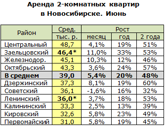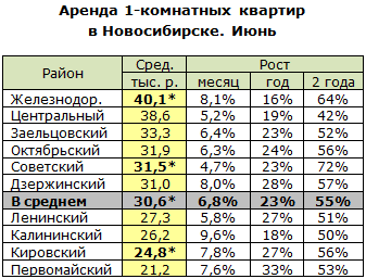 По сравнению с ценами декабря прошлого года среднее предложение по городу стало выше примерно на тысячу рублей в месяц. Железнодорожный район – самый привлекательный, за полгода средний ценник здесь поднялся на 4,5 тысячи рублей в месяц. Наиболее заметно на этом календарном отрезке снизилось предложение в Заельцовском и Октябрьском районах - примерно на 1,5 тысячи рублей.