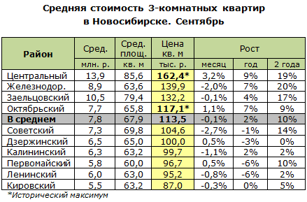 За минувший год средняя трёшка в Новосибирске стала дороже незначительно, лишь на 150 тысяч рублей. В Центральном районе, впрочем, рост вполне ощутим – 900 тысяч. По 500 тысяч накинули продавцы Железнодорожного и Заельцовского. При этом в трёх районах цена предложения за год упала - в Первомайском (-800 тыс. руб.), Ленинском (-500 тыс.) и Кировском (-100 тыс.).