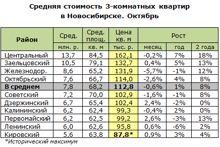 За минувший год средняя трёшка в Новосибирске стала дороже лишь на 100 тысяч рублей. Прилично сбросили цену продавцы Ленинского (-500 тыс. рублей), Железнодорожного (-300 тыс.) и Первомайского (-300 тыс.) районов. При этом ажиотажным спросом, судя по всему, стали пользоваться квартиры в Заельцовском, если за год цена предложения здесь выросла на 1,1 млн рублей. Октябрьские продавцы тоже подняли планку на 400 тысяч.