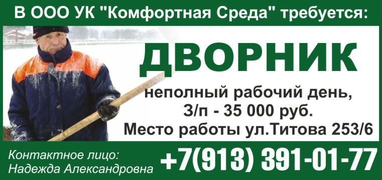 В ООО УК "Комфортная Среда" требуется ДВОРНИК, неполный рабочий день, ЗП 35 000 руб.,место работы ул.Титова 253/6, Контактное лицо: Надежда Александровна