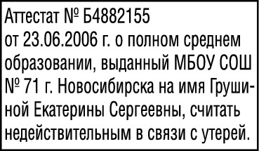 Аттестат№ Б4882155 от 23.06.2006 г. о полном среднем образовании , выданный МБОУ СОШ № 71 г.Новосибирска на имя Грушиной Екатерины Сергеевны считать недействительным в связи с утерей.