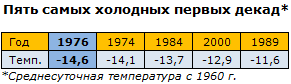 Этот год не пополнит плюсовой список, ибо после жаркой погоды в первый день температура уйдёт в ощутимый (но не жестокий!) минус. Лютый мороз, кстати, в это время случался частенько, до 28 градусов ниже нуля во второй половине прошлого века и до 25 в двухтысячных годах. Да и холодная пятёрка выглядит вполне по-зимнему: