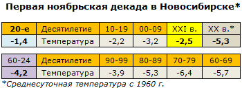 Ровно десять раз суточная температура в первой ноябрьской декаде была выше нуля за последние 65 лет (семь из них – в XXI веке). Пятёрка самых тёплых выглядит следующим образом: