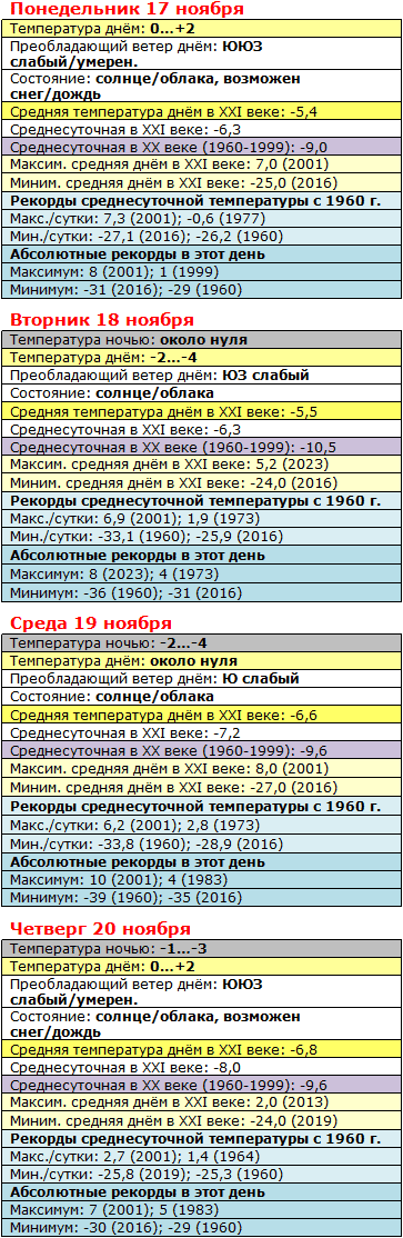 Именно на середину ноября в XXI веке в среднем приходится самое ощутимое похолодание в году – почти на четыре градуса по сравнению с первой декадой... но не в этот раз. То есть падение температуры будет (куда без него, коль зима так или иначе надвигается), но лишь на 2,5 градуса. В прогнозах на ближайшую неделю особых изменений погоды не предвидится...