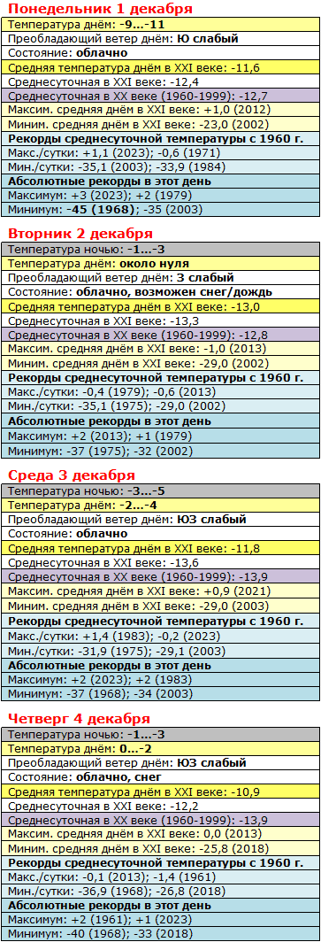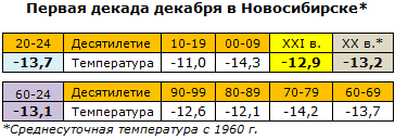 В среднем в декабре набирается по семь дней со среднесуточной температурой ниже 20 градусов, но месяц капризный: в прошлом году, например, вообще подобных морозов не было, а в позапрошлом зима лютовала почти две недели (9 дней столбик термометра даже ниже 30 градусов уходил). Хочется верить, что ожидаемые на выходных морозы надолго не задержатся, но кто знает... А вообще начало декабря в двухтысячных годах почти не изменилось по сравнению с второй половиной прошлого века, можете в этом убедиться: