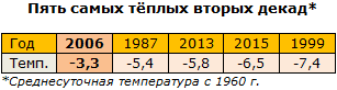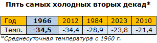 В 20-х годах самой тёплой оказалась прошлогодняя вторая декада (-8,3, восьмое место в рейтинге).