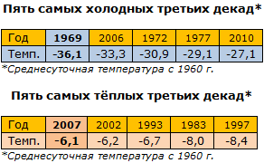 Две пятёрки самых отвязных декад случились давненько, а нынешняя вроде должна оказаться где-то в середине рейтинга. Но глянуть на эти аномалии всё же не помешает. В 1969-м, например, 40-градусные морозы держались с 17 по 28 января! А в 2007-м с 25 по 31 января столбик термометра время от времени добирался до нуля и залезал в плюс, а в последний день месяца поднялся аж до четырёх градусов выше нуля – абсолютный январский рекорд!
