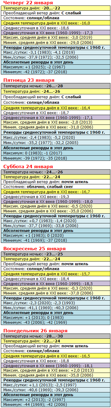 Только успели передохнуть опосля мощной холодной волны – и на тебе: опять на подходе морозы нехилые. Собственно, ничего хорошего от концовки этого месяца по определению ждать не приходится: с 22 по 31 января – самые холодные дни в году в двухтысячных годах со средней температурой от 18 до 19 с хвостиком ниже нуля. Но в ближайшие пять дней будет в среднем градусов на шесть ниже! Да ещё и почти без ветра – при хронических пробках на дорогах дышать придётся выхлопными газами.