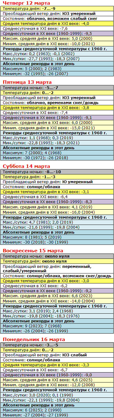 В ближайшие дни каких-то знаменательных событий и аномальных явлений не ожидается, зато на следующей неделе наступит весеннее равноденствие. 18 марта долгота дня составит 12 часов и 3 минуты – и далее каждый день пойдёт плюсовать по четыре с половиной минуты. А 22 марта средняя температура днём в XXI веке в Новосибирске выходит в плюс. Как будет в этом году, пока сказать невозможно, но вышеупомянутые весенние вехи определённо вселяют оптимизм. До среднестатистического окончания зимнего сезона в наших краях даже по меркам сильно потеплевшего XXI века пока ещё далековато – среднесуточная температура окончательно и бесповоротно выходит в плюс на погодном графике Новосибирска аж с 4 апреля.