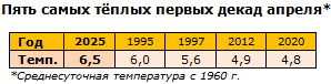 Эта декада далеко не всегда бывает в плюсе даже в сильно потеплевшем XXI веке: 14 плюсовых супротив 12 минусовых, преимущество невеликое и обозначилось только в последние годы. Судя по весьма оптимистичным прогнозам синоптиков, разрыв увеличится. В этой связи уместно будет привести пять самых тёплых декад, в которую, возможно, втиснется нынешний год (дальние прогнозы, во всяком случае, намекают на подобный вариант):