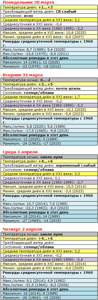 Общую картину месяца тёплая концовка всё же вытянула: март в целом примерно на градус превысит климатическую норму, сложившуюся в двухтысячных годах. А весна пришла аж на две недели раньше графика, который сложился в тех же двухтысячных. Более того, предполагаемое довольно тёплое начало апреля скорее всего сместит дату прихода весны с четвёртого на первое апреля: именно тогда среднесуточная температура в XXI веке чуть-чуть превысит нулевую отметку и в минус уже не вернётся. Напомню, что во второй половине прошлого века суточная плюсовая температура устанавливалась в нашем городе в среднем с 10 апреля.