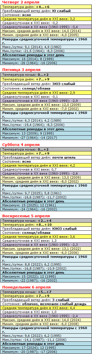 Первая апрельская декада статистически поднимает суточную температуру в двухтысячных годах с нуля в первых числах до полутора градусов к концу десятидневки. Реальный подъём ожидается гораздо интенсивнее: с трёх до 7-9 градусов – двухнедельное опережение графика!
