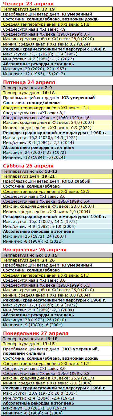 До 20-градусного рубежа столбик термометра добирается не в каждом апреле, но в последние двадцать лет – в среднем 3-4 раза в месяц, примерно вдвое чаще, чем в предыдущие пять десятилетий. В этом году тоже скорее всего наберётся не больше трёх таких дней, ибо после воскресенья температура резко упадёт, хоть и останется на несколько градусов выше климатической нормы.