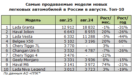 В модельном рейтинге по сравнению с июлем одно изменение: Haval M6 после трёхмесячного отсутствия вернулся в десятку бестселлеров. Выпал из ТОП-10 другой кроссовер - Jetour Dashing: возможно, снижение продаж было обусловлено повышением цены почти на сотню тысяч рублей.
