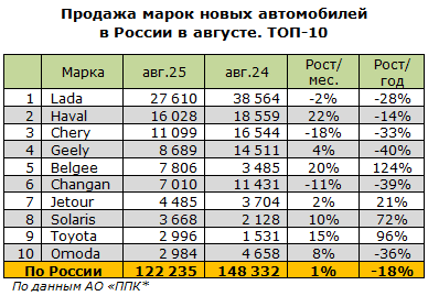 В августе в России было реализовано 122,2 тыс. новых легковых автомобилей: на 1% больше по сравнению с июлем, но на 18% ниже показателя годичной давности.