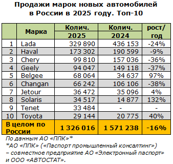 Рынок новых автомобилей всех категорий в 2025 году просел на 19%, продажи дотянули лишь до 1,485 млн единиц. Об этом рассказали на оперативке, которую 13 января провели эксперты аналитического агентства «Автостат». Легковушек в сравнении с 2024-м было продано на 16% меньше (с результатом в 1,326 млн), тяжёлые грузовики «обвалились» на 54%. Небольшую надежду вселило декабрьское оживление (на 7%) у легковушек (с ноябрьских 123 тыс. рынок дорос до 136,5 тыс. шт., что на 11% лучше декабря прошлого года), однако, по словам экспертов, спрос всколыхнуло лишь ожидание грядущего январского повышения утильсбора.