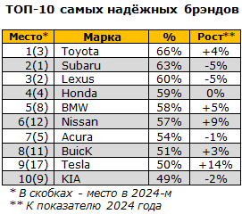 Японские марки заняли четыре из пяти первых мест. Лидером рейтинга стала Toyota (66%), прибавившая количество положительных отзывов за минувший год. Прошлогодние лидеры Subaru и Lexus чуть сдали позиции, но по-прежнему высоко котируются.