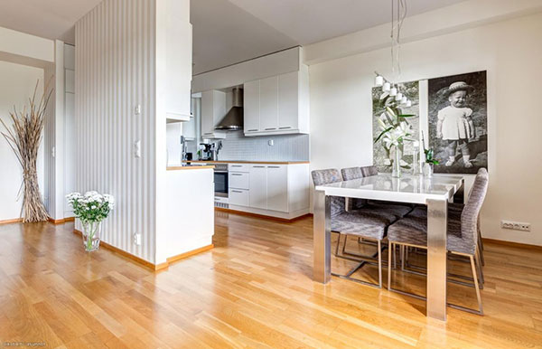 Этот природный цвет, естественный тон просторов снежной страны, является отличным фоном для различных оттенков (насыщенных, ярких, пастельных и пр.) и фактур. Такой цвет придаёт интерьеру лёгкость и простор, большей выразительности можно добиться, используя в гамме несколько оттенков белой палитры. Финнам импонирует также сочетание в дизайне белого и красно-бордового или синего цветов;