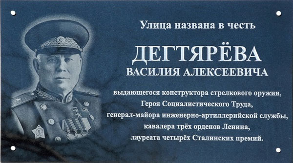 Отдельно можно выделить улицу, названную в честь Героя Социалистического Труда, генерал-майора инженерно-артиллерийской службы, доктора технических наук, Василия Дегтярёва, конструктора стрелкового оружия. В 1939 году он изобрёл станковый пулемёт, в годы войны — противотанковое ружьё и ручной пулемёт.