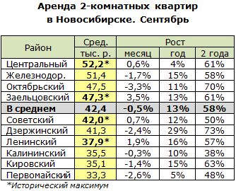 За последний год среднее предложение в городе выросло почти на пять тысяч рублей в месяц. Наиболее заметно - в Дзержинском (+9,5 тыс.) и Железнодорожном (+6,5 тыс.) районах. Меньше двух тысяч в месяц прибавили к прошлогодним запросам владельцы двушек в Первомайском и Центральном.