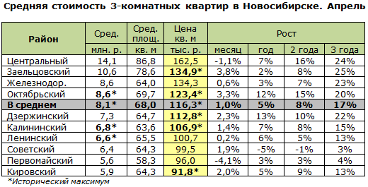 За два последних года стоимость трёшки в Новосибирске выросла примерно на 650 тысяч рублей. Максимально - в Центральном (+2,1 млн), Октябрьском (+1,3 млн) и Заельцовском (+1,1 млн) районах. При этом собственники трёшек в Первомайском районе стали скромнее в желаниях на 400 тысяч рублей, в Советском – на 200 тысяч.